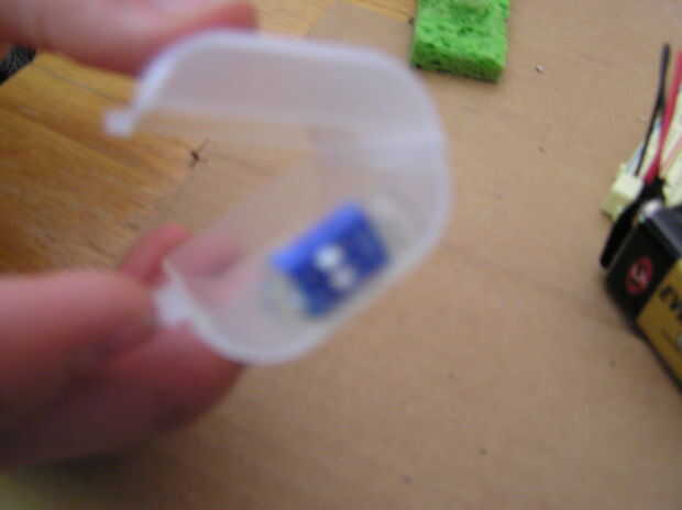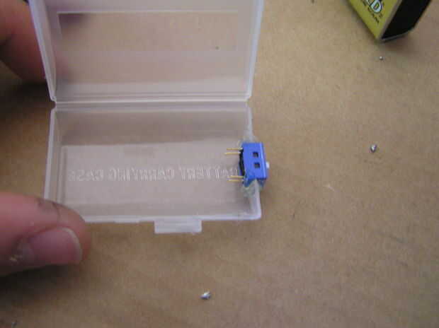 Cortar una muesca (o taladre un orificio) en la cubierta de la caja del proyecto. Coloque su conmutador tal que la parte basculante es que sobresale de la caja de la vivienda. Asegure el interruptor en su lugar con unas gotas de pegamento caliente. Asegúrese de que los cables del interruptor todavía están expuestos para que seamos capaces de soldarlos posteriormente.