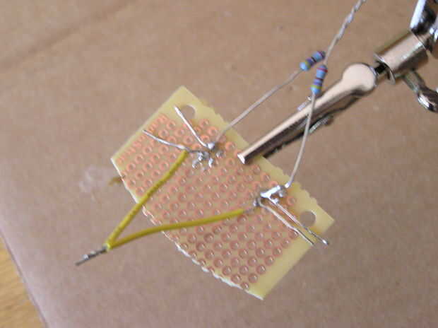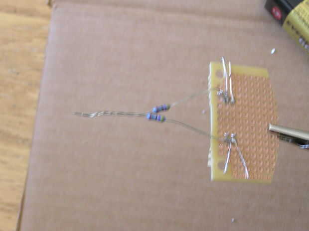 Uno de los extremos de la resistencia primera el cable negativo del primer LED de la soldadura. Repita este paso para la otra resistencia y LED. Luego toque los otros dos conductores de las resistencias. Torcer los cables juntos nos permite conectar los LED en paralelo.