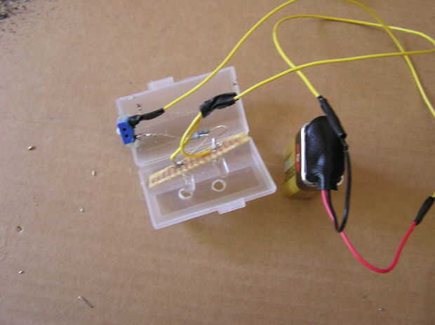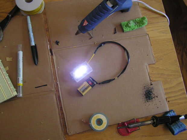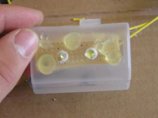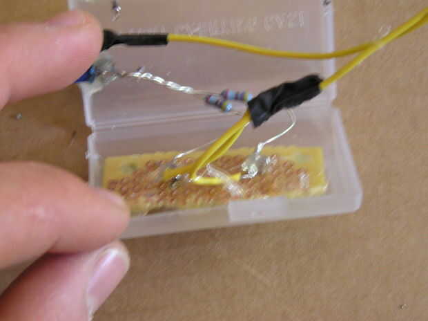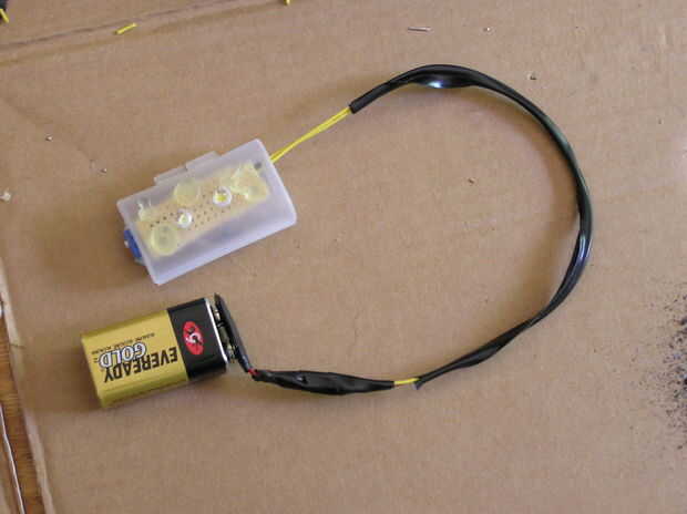 Después de montar el LED en los agujeros, fije la placa de circuito impreso en su lugar con pegamento caliente en las esquinas. Pase los cables de batería a través de la muesca en la caja que corte antes y cerrar la caja. Luego pega la caja a la montura, asegurándose de que el interruptor y LED permanece expuestos para su uso. Puede asegurar la batería en lugar de pegado a la banda de la cabeza, o poner la batería en una bolsa que se sujeta a la montura. Disfruta de tu nuevo proyector!