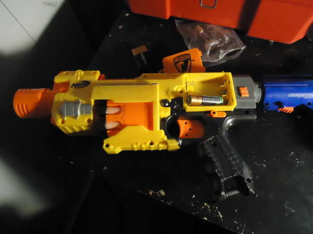 desmontadas mi nerf stampede mientras que en la actualidad en una pintura y construir mod para mi longshot. He aprendido a quitar el restrictor de aire, permitiendo así más energía. Aunque es considerada compleja por ser totalmente automático, el dis