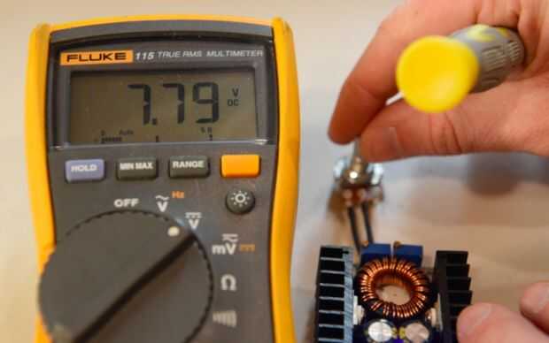 Ahora necesitamos ajustar la tensión de salida para que no exceda de 12 voltios. Si lo hace, Esto matará a nuestro LED. Gire el potenciómetro hacia la derecha. Luego con un destornillador pequeño, gire el tornillo de latón pequeño hasta que la tensión medida es de 12 voltios. Girando a la derecha (sentido horario) aumentará la tensión de salida, y la izquierda disminuirá.
