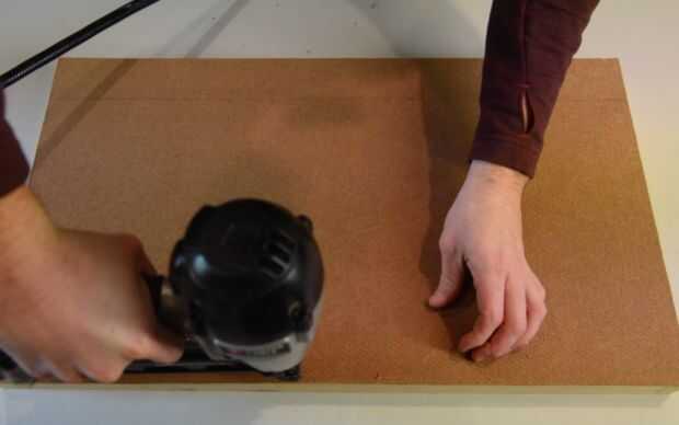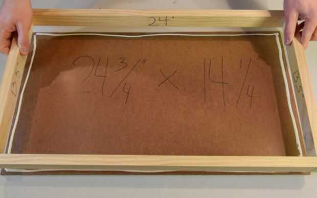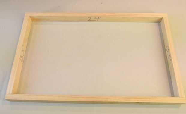 Hacer un cuadrado los 4 trozos de pie de pino en su lado de 3/4" de espesor. Asegúrese de que cada tabla tiene un lado de la misma veta expone que cuando el cuadro esté montado, sus dimensiones son 24,75" 14,25". Uso pegamento para madera y unos clavos para fijar los tableros juntos.