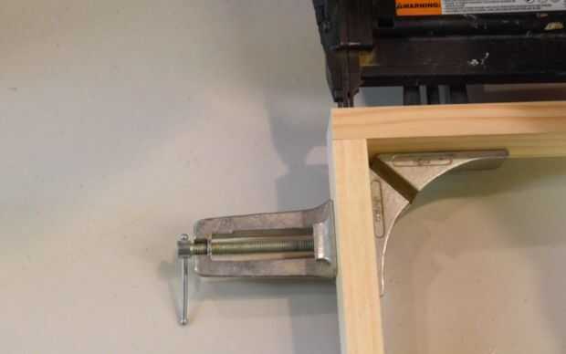 Coloque la madera prensada y pegarlos en el exterior, aproximadamente 1/4" en el lado. Establecer el cuadro que nos acaba de hacer sobre el pegamento. Voltear boca abajo todo el conjunto y dispara unos clavos en ella.