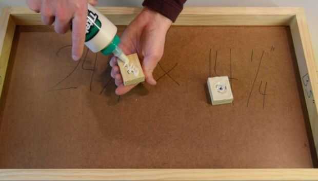 - Pegamento de la tuerca de la Junta de la tuerca de T en el lado derecho del panel (mirando en la caja), intercalando la T entre la Junta de 2" y el exterior de la tabla 13.5 derecha" en el marco de