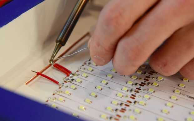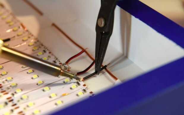 Desde un punto de vista eléctrico, estamos cableado todas las tiras de LED en paralelo (positivo con positivo, negativo con negativo).