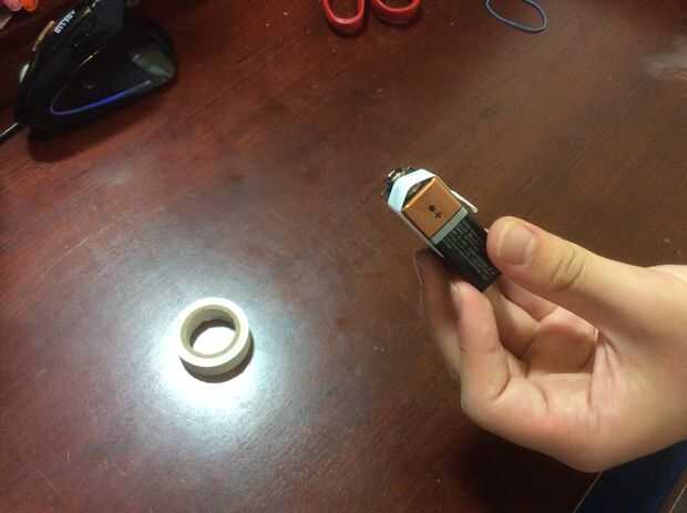 Tomar 7 cm de cinta aislante. Doble medio centímetro de la cinta hacia atrás a la cinta y, a continuación, ate la cinta de seguridad en el extremo positivo de la batería de 9v. Esto es para evitar que la lana de acero tocar ambos extremos de la batería, para que no encienda.