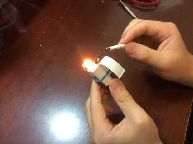 Despegue la cinta de seguridad de la el extremo positivo. Sacar el palo de madera y moverla para que la lana de acero toca el extremo positivo. La lana de acero rojo, así que asegúrese de tener cuidado de no entrar en contacto con la lana.