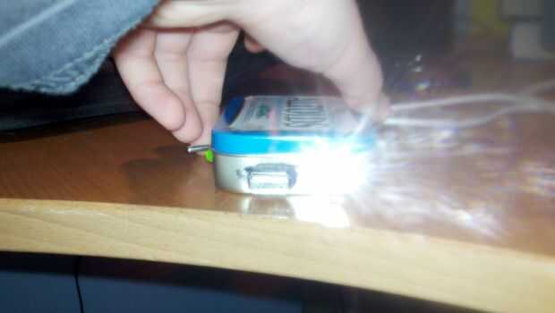 Hoy crearemos un puntero láser con alimentación solar.Partes:5V 300ma (o menos) el panel solar3.6V batería (yo usé uno de un viejo cable menos teléfono)al azar trozos de alambre, preferentemente rojo y negrolata Altoids (mmm wintry minty-ness)interru