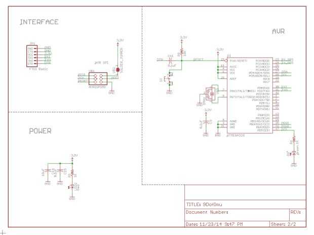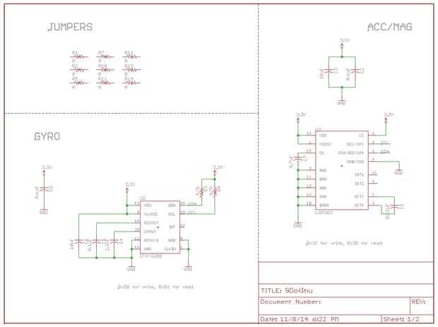 Trabajar los esquemas de Sparkfun para su junta con el nuevo chip acelerómetro/magnetómetro y me cambió todos los tamaños de resistor/capacitor a más paquetes de 1206 humanos. Usé unos puentes de resistencia de 0 ohmios en el circuito de la ruta en una sola capa. Todos mis archivos del eagle están incluidos en el repositorio de github.