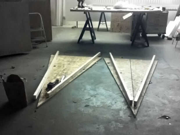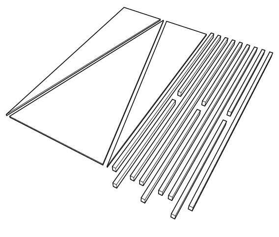 Corte cortes de la madera contrachapada con 2 diagonal desde una esquina hacia el punto medio del lado opuesto. Corte 3 pedazos de la madera de construcción dimensional exactamente por la mitad.