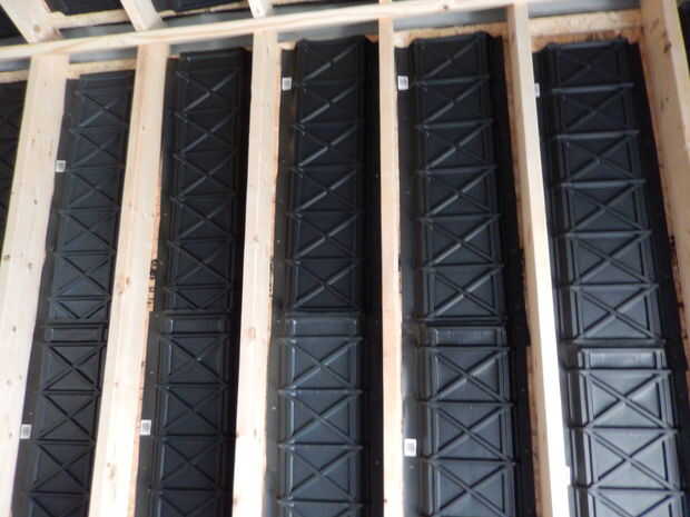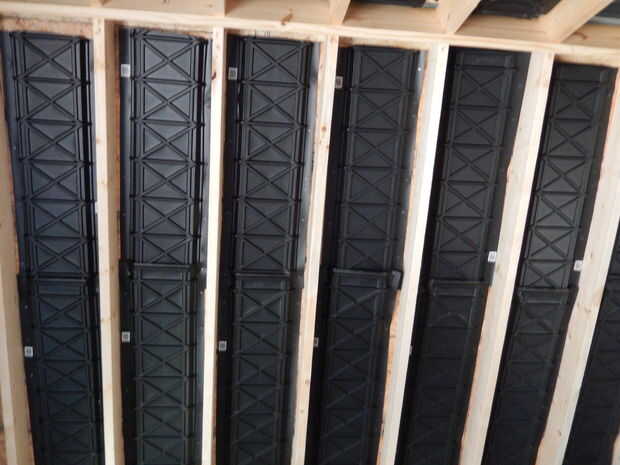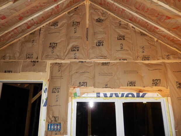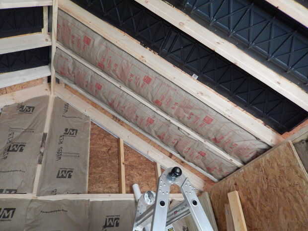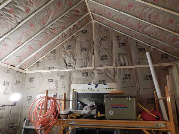 Antes de cualquier aislamiento, tomé sellador de espuma en un poder y espuma de sellado de grietas, hendiduras o agujeros aburridos, para mantener fuera la humedad, insectos y corrientes de aire. Las paredes fueron aisladas con rollos de Johns Manfield R13. La bóveda fue aislado con rollos de Dow Corning R19, corte personalizado para adaptarse. ¡ Wow, qué diferencia de ruido y temperatura por ello. La línea del techo es ventilada con una cresta continua línea de ventilación y la entrada de aire es un respiradero de sofito continua. Usé las rejillas de ventilación de plástico viga grapados en la parte inferior de la superficie del techo para que tenga flujo de aire continuo de sofito a la línea de cresta. Que la cabina está en un crecimiento maduro de maderas, no vea mucho la luz solar directa, pero esto debería ayudar a ventilar la humedad.