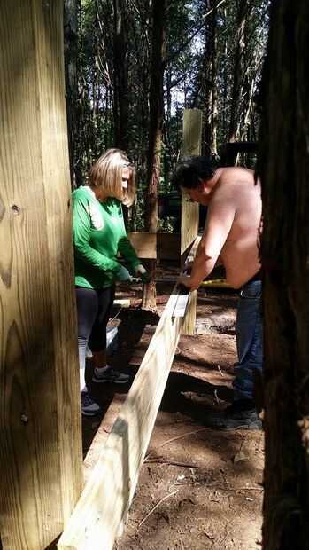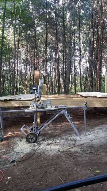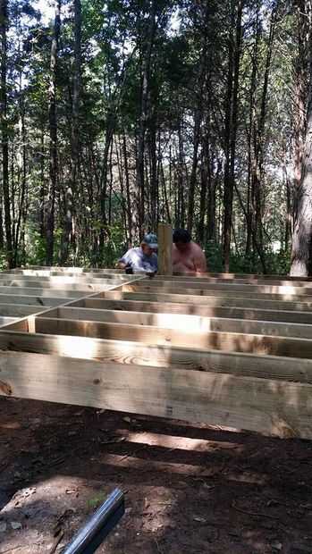 Después de secado un poco de todo la lluvia que había, tuve que sacar todos los puestos de los agujeros y tomar un cavador del agujero de poste y retirar todos los sedimentos que habían lavado en alrededor de los postes. Después de conseguir todos los agujeros que se limpian, me vuelva a colocar los postes en los agujeros y cuadrado todo para arriba y consiguió que todos los postes del plomo. Cada agujero tiene 240 libras de concreto. Es un total de 1440 libras de concreto. Después de dejar la configuración concreta y curación durante una semana, empecé a enmarcar a las vigas del piso. Las vigas del piso son de madera tratada de 2 x 10, en centros de 16". Tuve algunos ayudar a levantar las vigas y asegurándolos. También instalé un tablero saliente en la parte inferior para ayudar a sostener los tableros de viga mientras asegurándose de que todo estaba cuadrado y plomo, después de que las vigas fueran todos instalado, había establecido el subsuelo de la cabaña y también poner el 2 x 6" tablas abajo de la cubierta del porche delantero. Todas las vigas exteriores se quedado a 6 x 6 entradas con 3/8 "x 4" galvanizados pernos. Todo lo demás fue sujetado con T25 tornillos 3" cubierto de. Sin clavos.