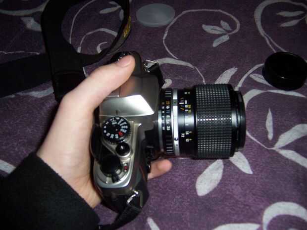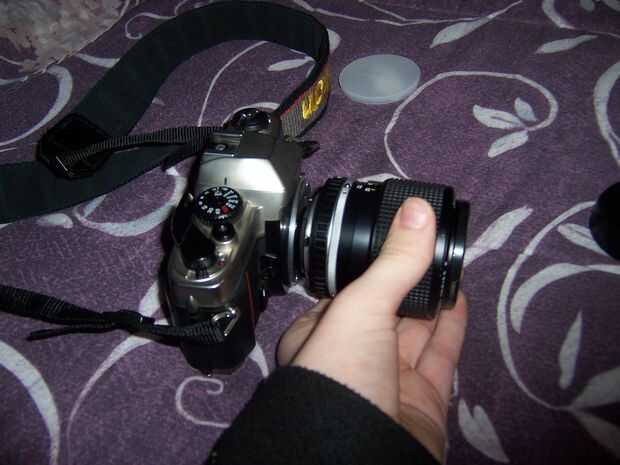 Poner la lente en el cuerpo de la cámara. Los números (abertura números. hay un nombre para ellos, no sé mano.) deben hacer frente a la derecha, aplicando ligera presión gire la lente hacia la izquierda.