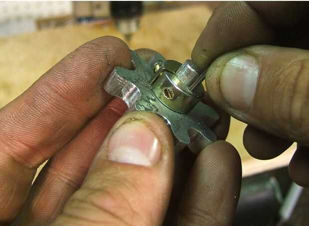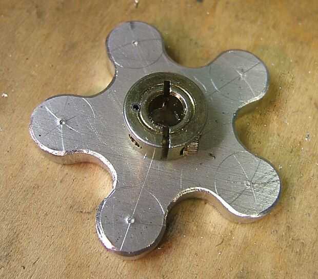 El mando puede ser cualquier forma, pero lo hice en una forma similar como los engranajes. Es necesario un agujero de centro, 1/4" de diámetro y un collar de eje de 1/4" a la perilla con un perno de tensión (ver fotos).