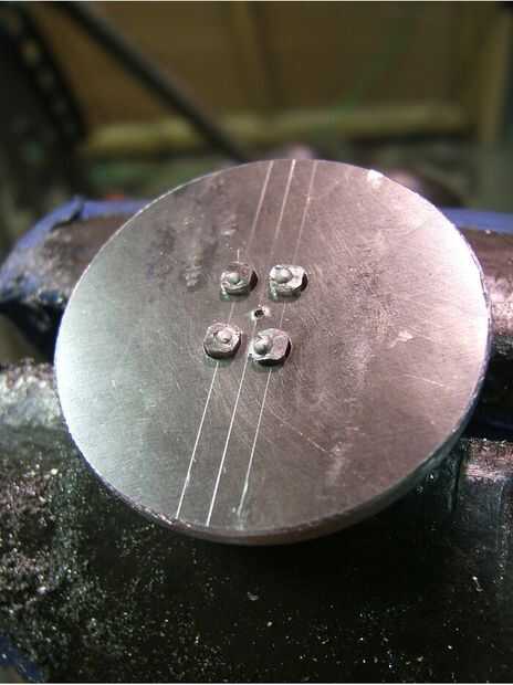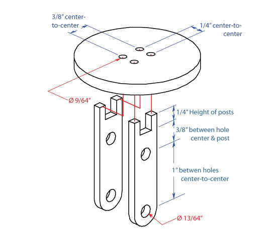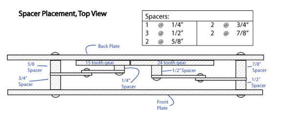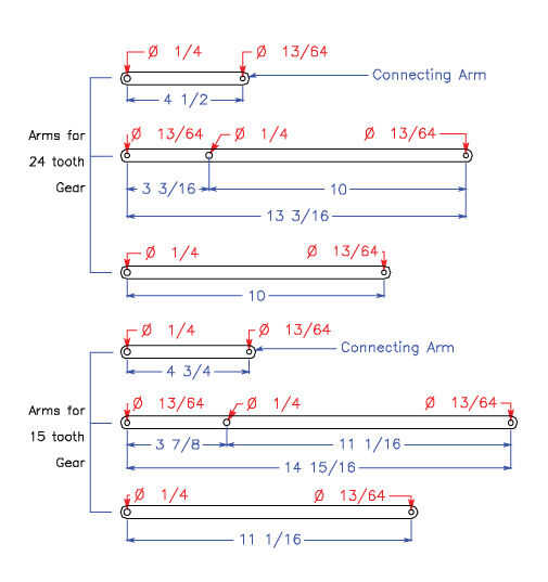 Los brazos se cortan de 1/8 "x 1/2" de aluminio manillar plano. Consulte la tabla a continuación. Usted también necesitará cortar los espaciadores de los brazos para que no chocan entre sí o con los tornillos que sobresalgan que sostienen los engranajes en el chasis. Los soportes de la vela se hacen de dos piezas del mismo material, además de un disco de corte de alguna otra placa (yo usé 3/16 placa de aluminio). Los discos están perforados y cortan de las piezas del soporte para que forman espigas que pueden ser estacadas en el disco. Por último, un anillo de goteo de vidrio (éstos también se llaman arandelas) se ajustaron al disco para mantener la vela en su lugar.