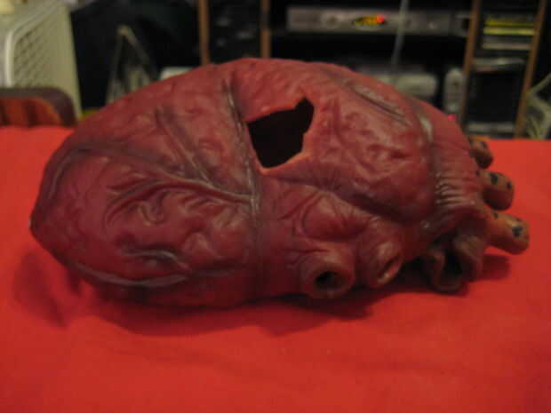 A continuación, perfore agujeros en las válvulas del dos corazón donde se pegará el tubo de la sangre a chorros hacia fuera. Digo "drill" pero he usado un par de tijeras. Esto depende de todo el material y el grosor de tu corazón.