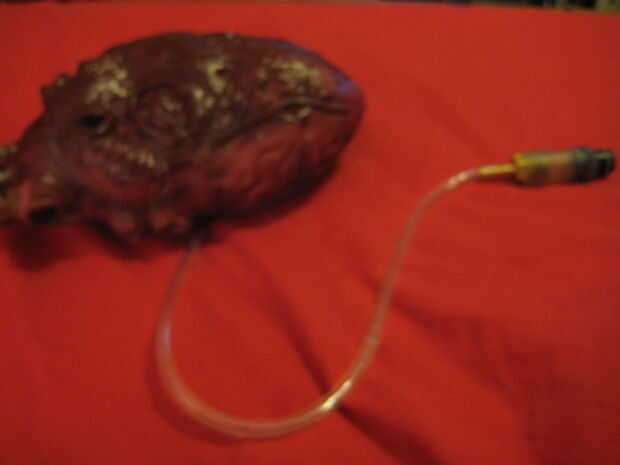 Ahora, coloque los tubos de dos split y la T en el gran agujero en el fondo del corazón y alimentar los tubos de dos extremos a través de los orificios en el corazón "válvulas". Esto puede ser complicado, por lo que no se preocupe de hacer un agujero más grande si es necesario. He encontrado algo que se pega por la parte exterior del agujero de la válvula facilitado la tubería a través de los pescados. Después de tirar el tubo a través de, empuje por lo que no es muy notable.