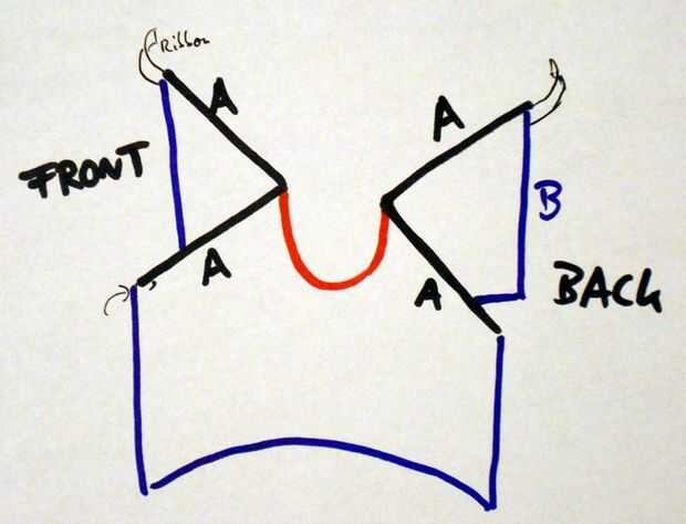 Hacer un ejemplo: digamos que la circunferencia de la cintura es de 100cm, entonces la parte delantera y trasera debe ser de 66cm de ancho. Esto significa que cada parte obtiene 33 cm + 2 cm para el dobladillo (valor de A en la imagen).