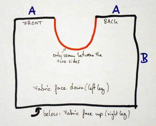 La primera foto es el modelo plano que usted necesita cuando usted pone la tela en el suelo, sus cara a cara de dos capas. La segunda imagen muestra los pantalones en el paso 5 después de unir las partes en la costura principal.