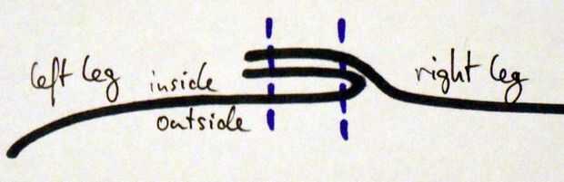 Ahora comienzan a fijar la costura entre las dos piernas con pernos de fijación. Sólo poner un lado encima del otro y fijarlo con un alfiler.