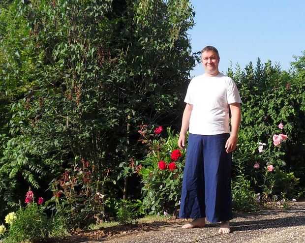 Yo me vestiría así. Coge la parte posterior y fijar con la cinta, luego agarrar la parte delantera entre mis pies y fijar demasiado.