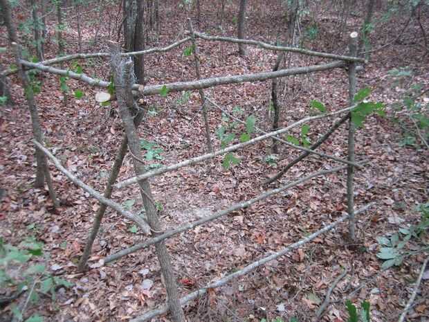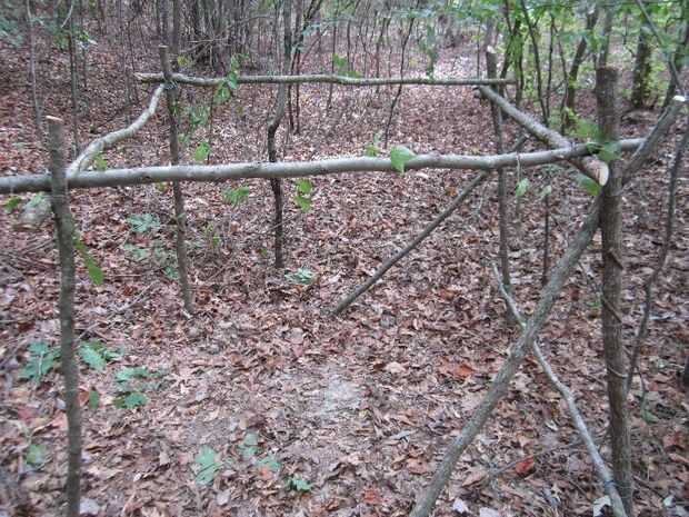 La pared posterior es un poco diferente de la primera muralla. Construir un cuadrado simple con sus plantones como antes, pero añadir un montante adicional aproximadamente 20 pulgadas de un extremo. Este será el marco para una entrada a los ciegos. Levántese con cuidado esta pared y fije a la pared primera con cable y ayudas horizontales.
