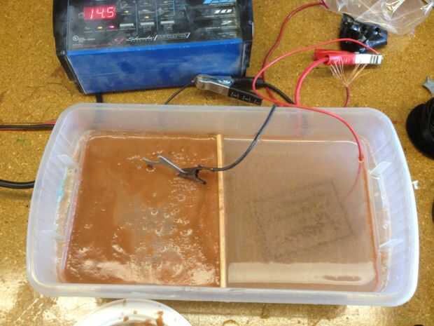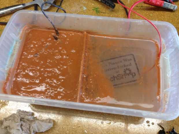 Encender la fuente de alimentación, y usted debería ver las burbujas comienzan a salir a la superficie de la placa. Dejar la burbuja para como quieres. Cuanto más usted lo deja burbujear, más profundo será grabado. Si el agua salada se convierte en realmente oscuro después de un rato, apague la fuente de alimentación y sustituir el agua nuevas con agua con sal y continuar. Tenga cuidado si lo dejas grabar demasiado porque usted comenzará a obtener "socavando" donde el metal comienza a ser comido hacia fuera por debajo de la máscara de vinilo.