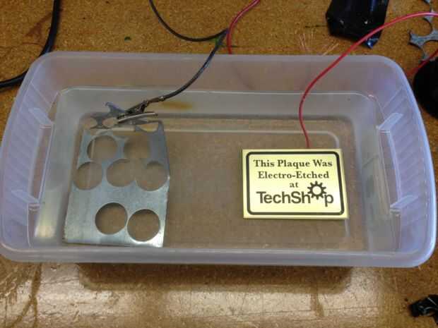 En vez de un sacrificio pedazo de metal, podría utilizar una olla de acero inoxidable y ponga el negativo (-) pinza justo en el borde de la maceta. Entonces sería poner la pieza de trabajo en el bote, junto con el agua salada y grabado justo en la olla. Basta con asegurarse de que la pieza de trabajo no tenga contacto con la olla eléctrica.