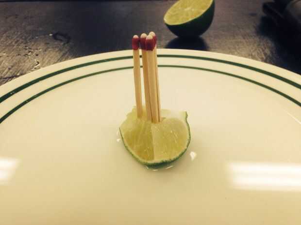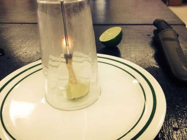 Pegar a 4/5 partidos en la cal con los jefes de los partidos juntos. Utilice al restante partido a la luz el "pastel de cumpleaños de cal". Voltee el vidrio en la parte superior los fósforos encendidos. Si el sello entre el vidrio y la placa es suficientemente fuerte, puede levantar la placa de la tabla. Si utilizas cristal auténtico para este experimento, sólo tenga cuidado de no dejarlo sentado por demasiado tiempo porque se corre el riesgo de su rotura de vidrio.