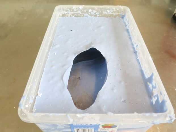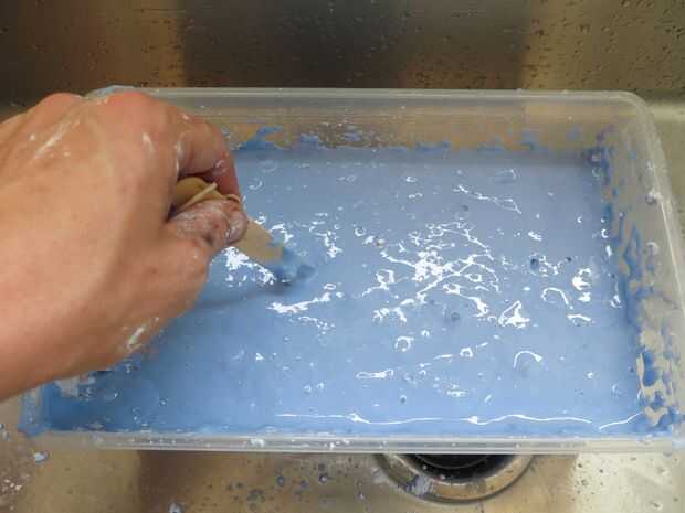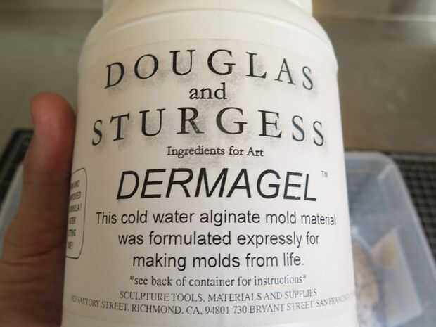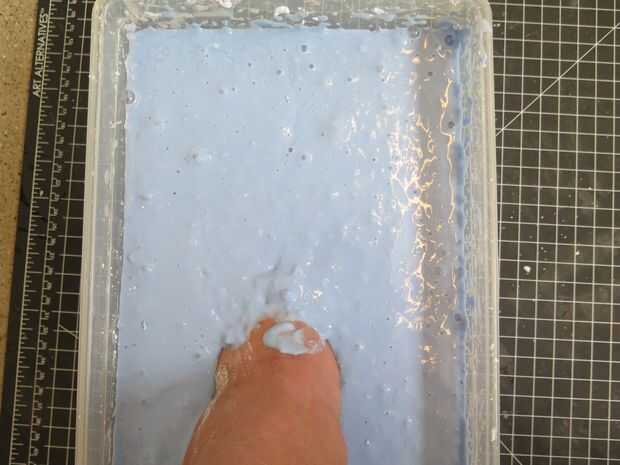 Tirar un puñado de aquel polvo de alginato en el tupperware que es aproximadamente la mitad la altura necesaria para cubrir el pie. Añadir agua hasta llegar a una consistencia de pudín y comenzar a mezclar. Se puede medir por el volumen si quieres (recomiendan 1 parte alginato 1,5 partes de agua por volumen de éste), pero me parece que va por consistencia más fácil. Una vez que empiezas a mezclar, empieza a así que apresúrese!