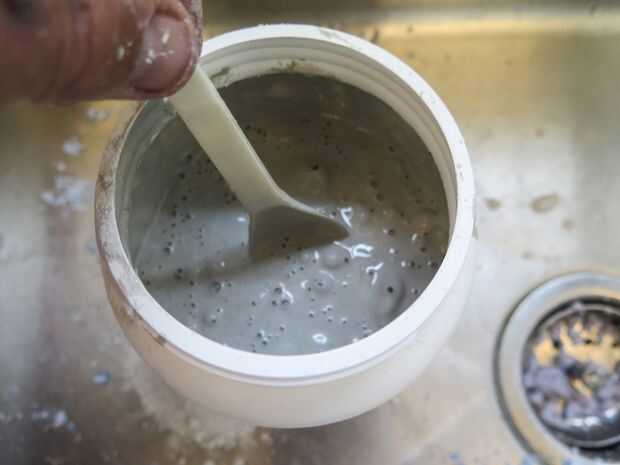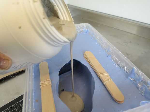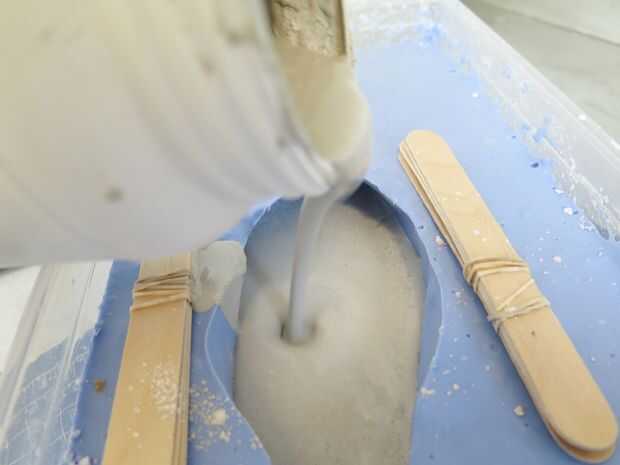 Tiempo para hacer unas botas de cemento. Vierta algún polvo de concreto en una tina de mezcla que no encantan y añadir agua hasta llegar a una consistencia de pudín. A la mezcla y vierta en el molde de pie. Si no tienes suficiente (pies pueden ser grandes cosas!), sólo poco más de la mezcla y mantener verter hasta llegar a la cima de su molde.