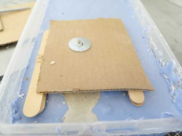 Cuando completamente has vertido el hormigón, sumerja la cabeza de su tornillo con la arandela y la tuerca en él y colocar la cartulina con el apoyo de palillo de arte.