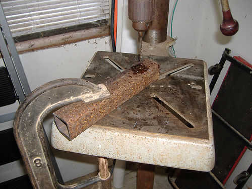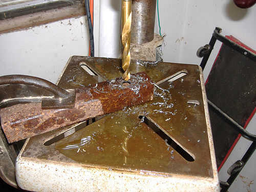Usé 4 graduaciones con el último ser la broca de 1/2. Usé la mitad una botella de aceite de motor para guardar los pedacitos de la quema. Es un desastre!! Asegúrese de que tirar un balde debajo de la prensa de taladro.