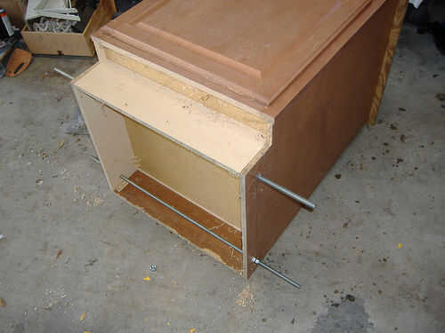 Diferentes tamaños de palancas o ruedas pueden significar un lugar diferente para éstos. Lo que quieres es las palancas para poder girar fuera del camino cuando están arriba, pero lo suficientemente cerca a la parte inferior del gabinete que las ruedas se pegan abajo.
