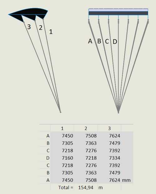 Hice un pequeño programa que podía calcular las longitudes de línea de la brida para mí, y el resultado puede verse en la tabla. Estoy seguro de que este cometa es escalable a algunos extienden, tuercas para ir con la calculadora si quieres en un tamaño diferente.