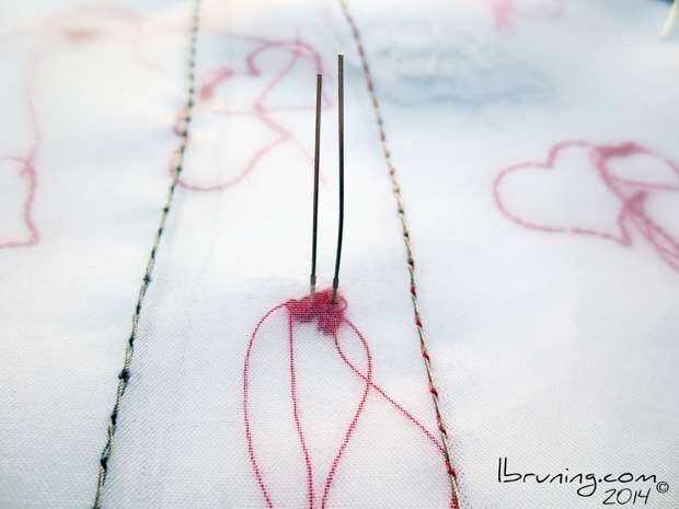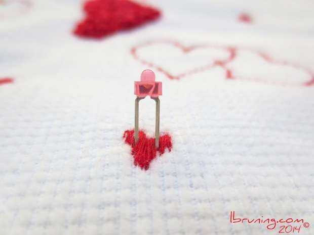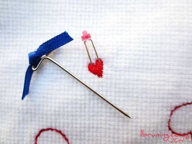 Utiliza un alfiler para primeros agujeros de apuñalar a través de los tejidos, insertar los LEDs empujando el metal conduce desde la parte delantera de la tela de moda a la guarnición trasera. Los hilos de metal se doblan para conectar con las huellas positivas y negativas.