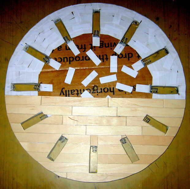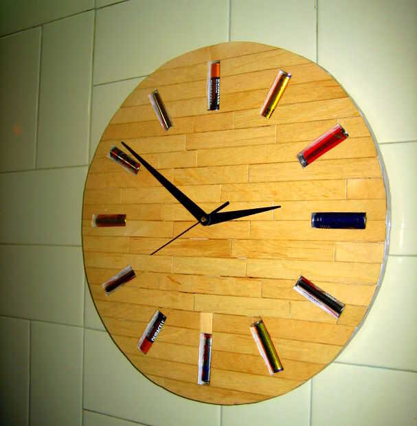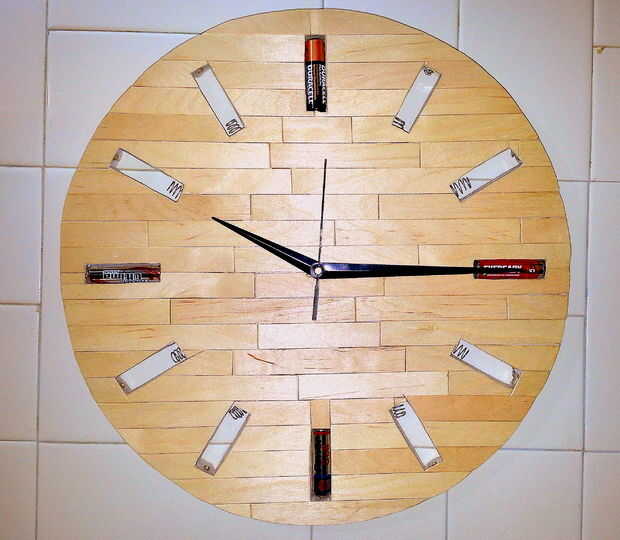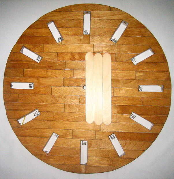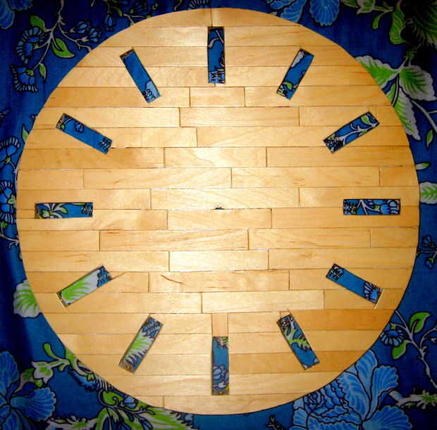 Ahora comienza la diversión parte! De cubrir toda la cara frontal del reloj con depresores de lengüeta de madera. Utiliza a estos como estos son más anchos que los palitos y por lo tanto tomó menos tiempo y esfuerzo para cubrir el reloj entero.