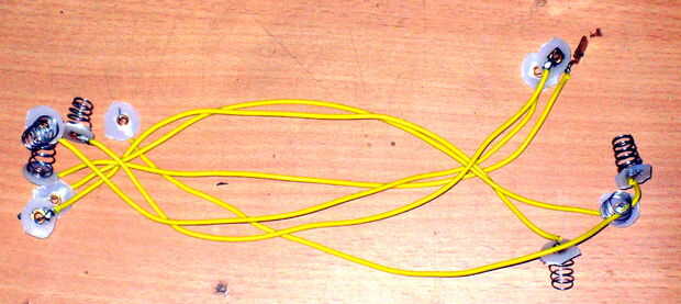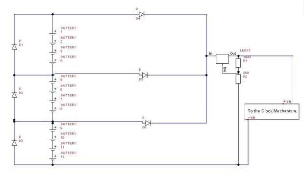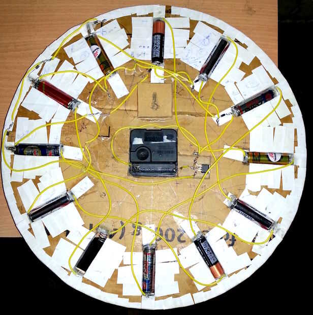 He decidido agrupar las celdas de un grupo de cuatro patas (grupos de tres en total). Así, en un momento dado, el reloj podría funcionar incluso con tan sólo cuatro células. En el caso de las 12 celdas están conectadas, según el esquema que he usado, todos estarán en