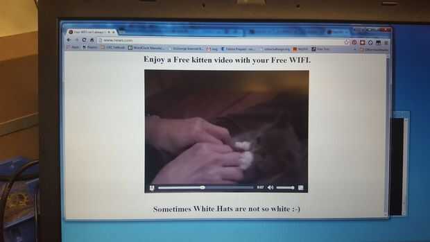 Bueno, tengo una respuesta fácil para eso - por qué cuando secretamente es un punto de acceso WIFI gratuito que actúa como un servicio a la comunidad. Conectar con ella (se anuncia claramente como "FreeWIFI"), y hará todo lo posible para hacerle saber que Wi-Fi gratuito no siempre es lo que espera mediante la entrega de un video de gato amigable.