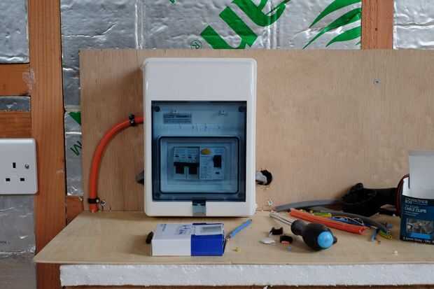 Corrí el cableado a través de los postes de madera, a 300mm sobre el piso para todas las ejecuciones de horizontales. De esa manera sé donde están los cables, después de que las paredes están acabadas. tres lámparas de la pared y estaban previstas tres tomas dobles. Usé a una "unidad de consumo de garaje" para proporcionar una fuente de alimentación protegida. Me permite un generoso margen de seguridad en las especificaciones del cable que utiliza. Tenga en cuenta que si el cable eléctrico se ejecuta en un espacio aislado es capacidad de carga actual es downrated levemente. La longitud de la carrera también es relevante.