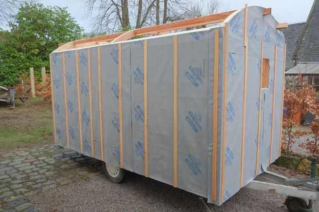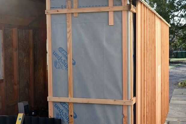 Las paredes externas se cubrieron con membrana de respiro y luego sables forzadas para el revestimiento. Listones verticales de 15mm fueron agregados en primer lugar, para permitir un espacio de circulación de aire detrás del revestimiento. Siguiente, horizontal 25mm listones fueron clavados en. Estos utilizarían para fijar el revestimiento en.