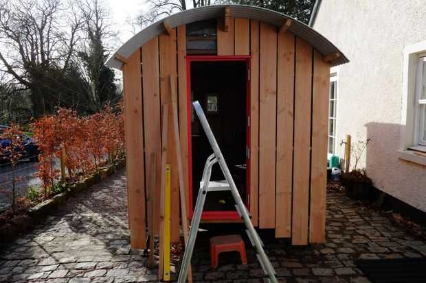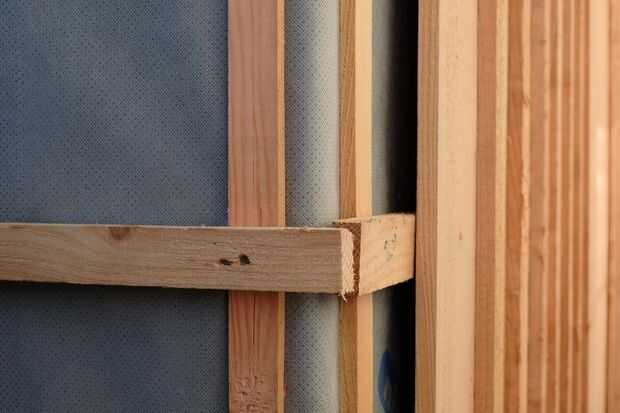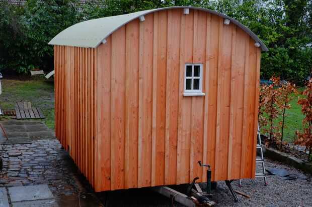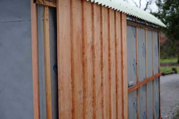 Las paredes estaban vestidas estilo "tablero & batten" con 15mm creo que revestimiento de abeto de Douglas. Cada tabla fue clavada en su centro, por lo que cada clavo en; y pasa a través de una placa de revestimiento. Esto permite la expansión y contracción de juntas entre el clima húmedo y seco.