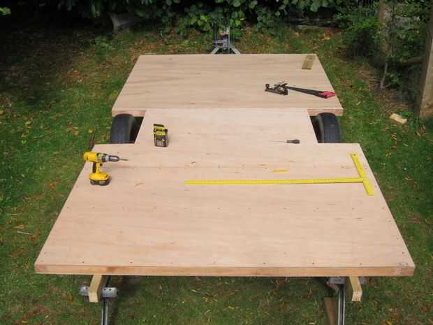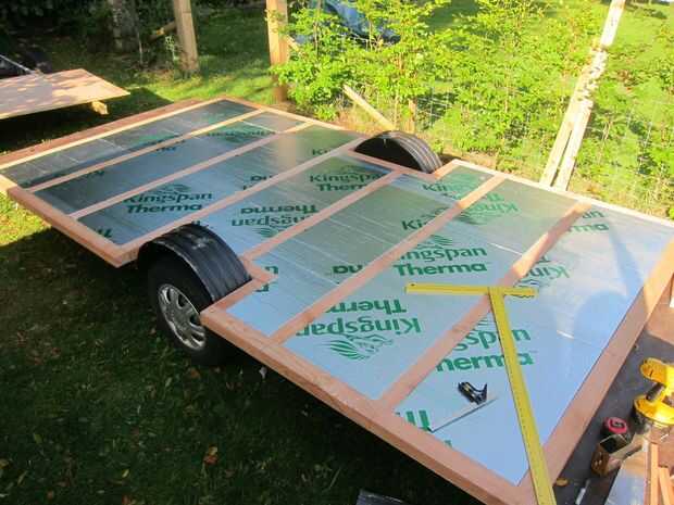 El piso está hecho de dos capas de contrachapado estructural, impermeable de 9mm con un sándwich de 50mm de aislamiento rígido entre porras de 75 x 50 mm. Usé caseros (escocés) abeto de Douglas para los listones por su ligereza y resistencia. Todas las juntas estaban pegadas con poliuretano, pegamento en expansión y se atornilla. Quería que ser rígido, ligero y lo suficientemente fuerte para manejar el traqueteo de los viajes de carretera.