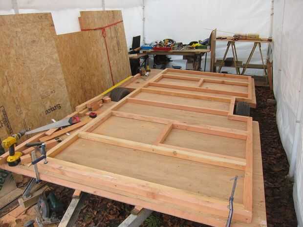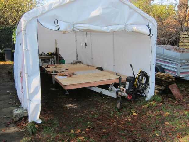 Empernaron el piso ahora completo al chasis usando los puntos de montaje originales más dos extras más (probablemente innecesarios) dando un total de 7. Perforé hacia arriba de debajo para evitar el error. Apretaron los tornillos cúpula encabezada hasta la capa de 9mm comprimida unos 3-4mm. Arrastró el chasis "interior" a un coche cubierto-puerto (Costco £240 libras Esterlinas) para protección contra la intemperie. Usé el piso terminado como un banco de trabajo y plantilla para el montaje de las paredes. Otra vez con clavos de 50mm x75mm abeto de Douglas. Es una madera muy agradable para trabajar con, lleva tornillos bien y es relativamente ligero por su fortaleza y también resistente si se utiliza la madera de corazón bastante tiempo. Atento: aparece como un agresivo irritante si se inhala el polvo. Gran olor cuando corte.