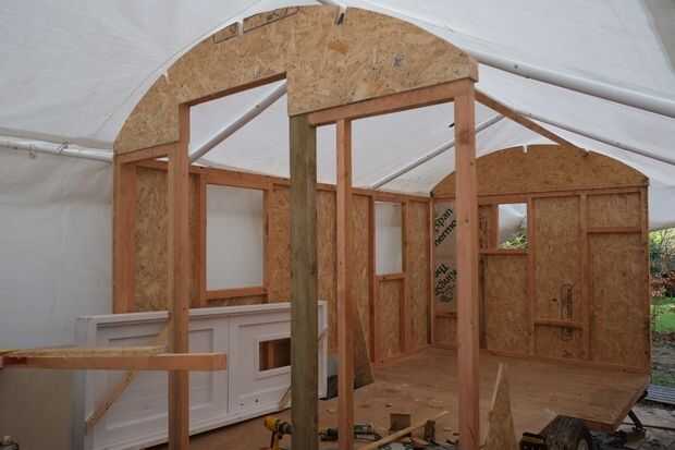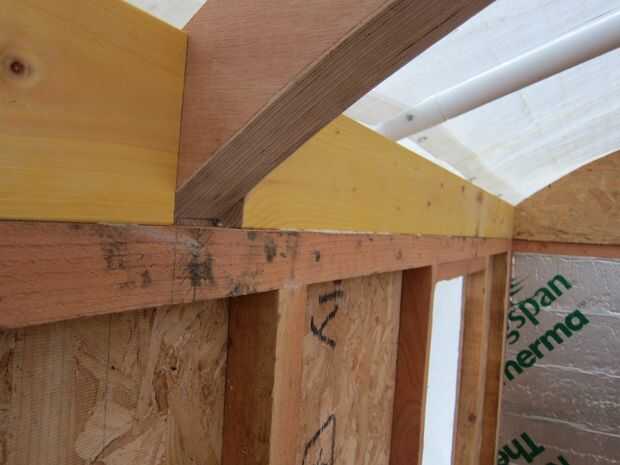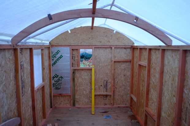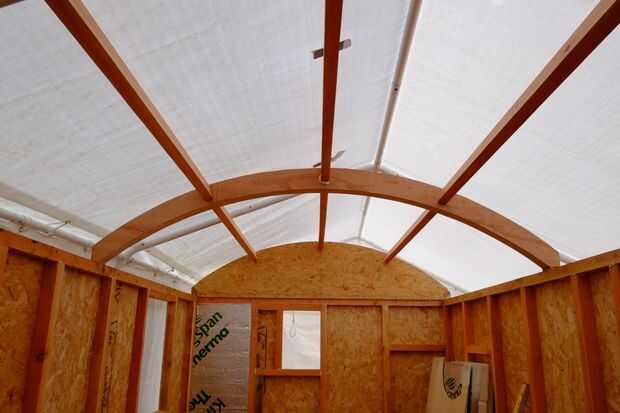 Hice un arco central de tres secciones de madera de 22 mm pegadas y corte al radio del techo. Tenga en cuenta que el arco era 100mm de ancho, por lo que el radio de la curva inferior es 100mm menos que la curva superior. Las muescas fueron cortadas para las correas, pero sólo a media profundidad, las correas también están recortadas. Las juntas estaban pegadas con un tornillo largo y delgado para apretar la articulación mientras el pegamento seca. Nota: Cuando que termine la choza, había corté la forma de la curva once veces en cuatro materiales diferentes. Como dije, realmente deseo que había hecho una plantilla.