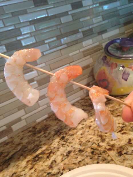 Para comenzar, presione un pincho por el camarón crudo. Poner en cuatro a seis camarones (4-6), porque no quiere que se llena o insuficientemente cocida.