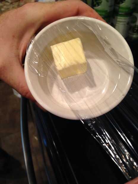 estoy bastante seguro de que cada ser humano sabe cómo derretir la mantequilla, pero acaso no sabes, te diré cómo. Colocar cucharadas dos 2 (cucharadas) de mantequilla en un recipiente de vidrio. Entonces, para evitar que la mantequilla explotando todo el horno de microondas, coloque algunas envolturas de plástico sobre él y ponerlo en el horno de microondas por 30 segundos.