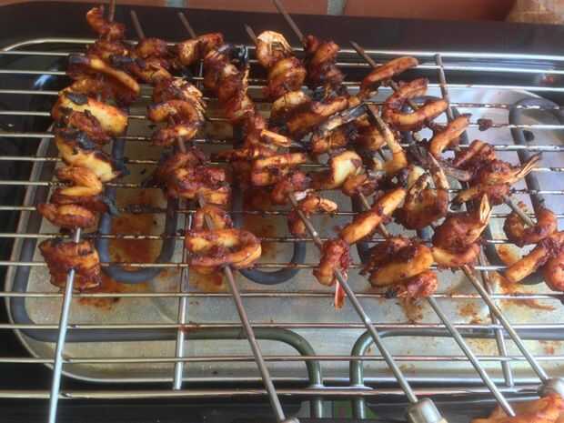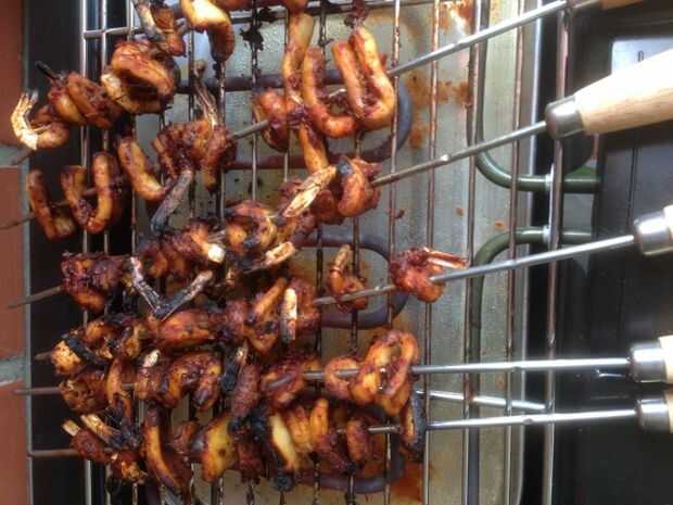 Estaba un poco demasiado sorprendido de leer esta receta 'a la brasa comida de mar con miel'. ¿Cómo lo sabrían? ¿Dulce o sabroso? Bueno aquí está, probé con mi propia salsa barbacoa en vez de usar la salsa embotellada. Resultó gran.