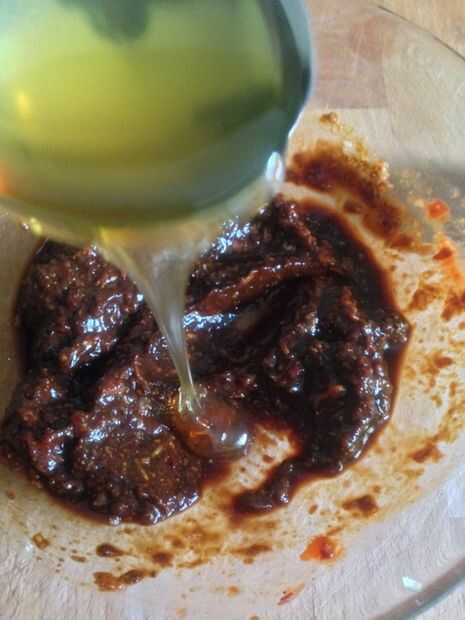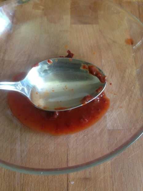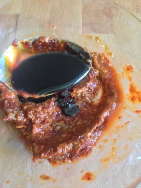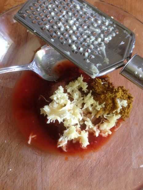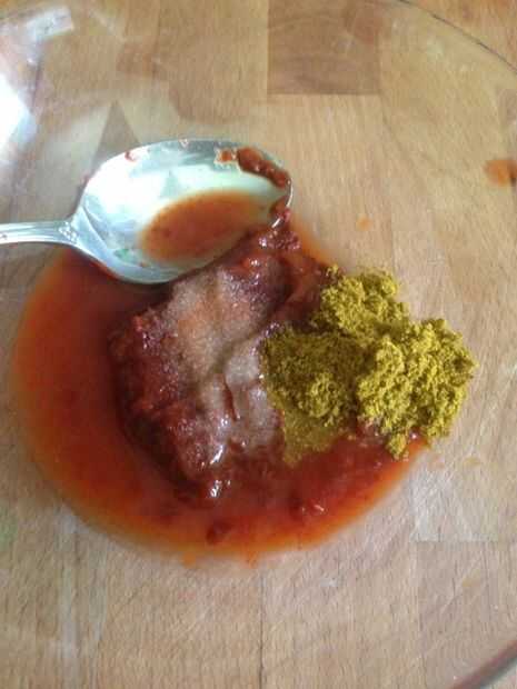 La receta original es embotellada barbacoa salsa, en vez de salsa de barbacoa botella he hecho mi propia salsa de barbacoa que es mucho más sabrosa. Mezclar todos los ingredientes (pasta de pimentón, vinagre, sal, polvo de Curry, salsa de soja, miel, ajo) junto con ajo finamente rallado. Esto puede ser embotellado y refrigerado por un par de días. Puedes hacerlo a una pasta o poco acuosa a verter sobre.