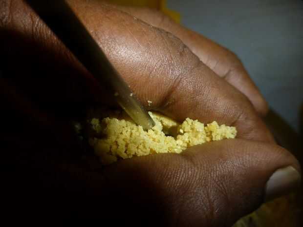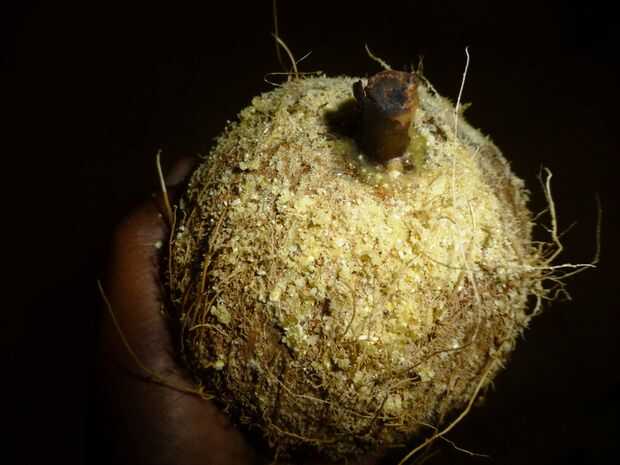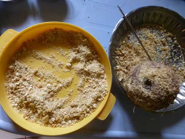 Los dedos en el agujero y utilizar el pincho Presione la mezcla de ingredientes dentro de la taza. Tarda unos 10 a 15 minutos para esto. El coco debe completarse en su totalidad, no dejando espacio vacío interior.